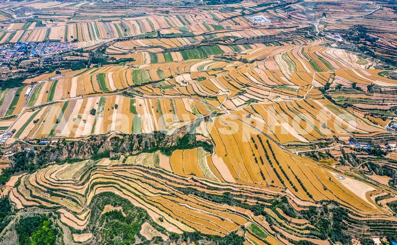 2020年6月3日,正值小麦成熟收割期,山西省运城市闻喜县河底镇,金色的小麦把层层梯田装扮的分外妖娆,格外壮美,空中俯瞰,宛如一幅大气蓬勃的金色田园画卷,十分壮观。