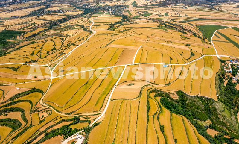 2020年6月3日,正值小麦成熟收割期,山西省运城市闻喜县河底镇,金色的小麦把层层梯田装扮的分外妖娆,格外壮美,空中俯瞰,宛如一幅大气蓬勃的金色田园画卷,十分壮观。