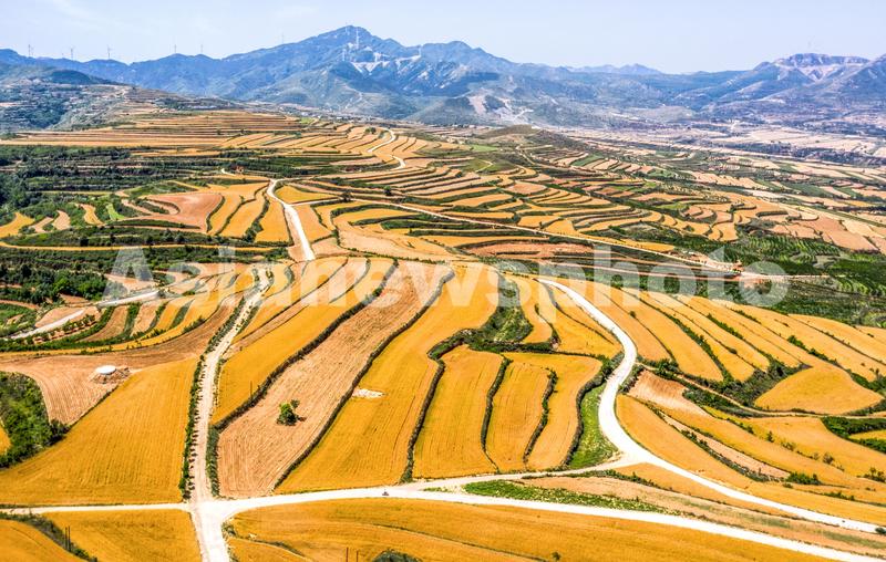 2020年6月3日,正值小麦成熟收割期,山西省运城市闻喜县河底镇,金色的小麦把层层梯田装扮的分外妖娆,格外壮美,空中俯瞰,宛如一幅大气蓬勃的金色田园画卷,十分壮观。