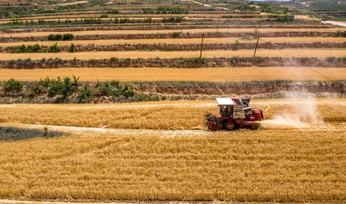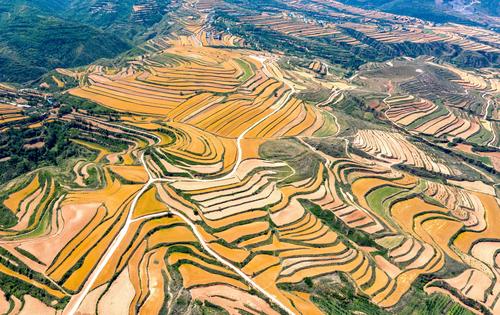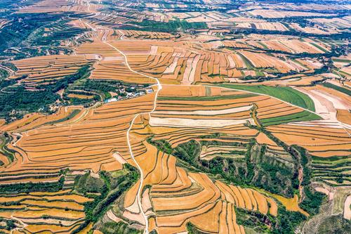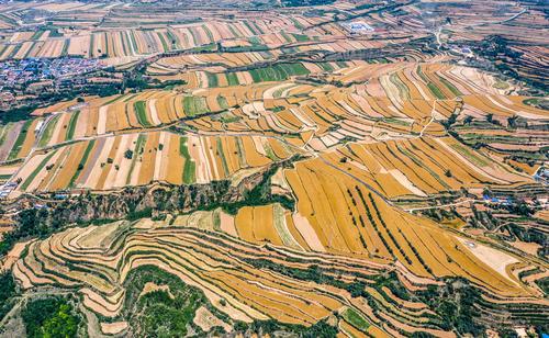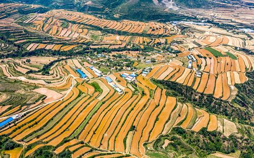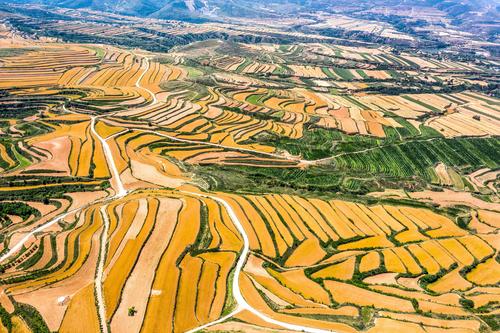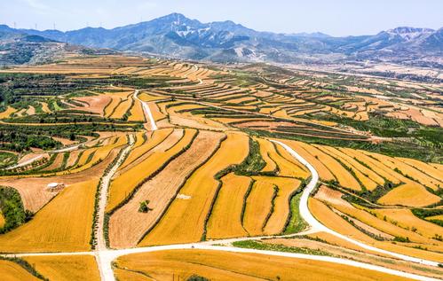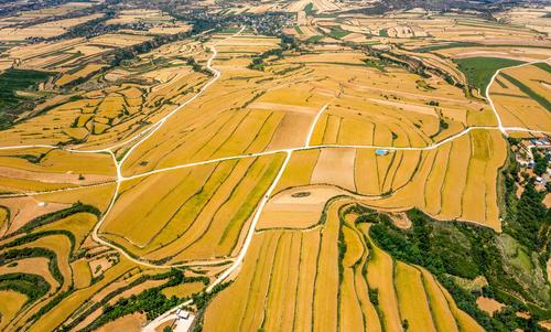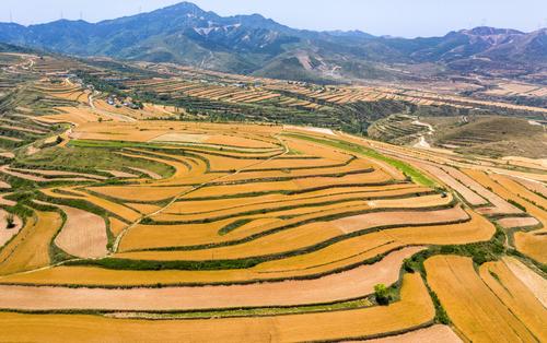 2020年6月3日,正值小麦成熟收割期,山西省运城市闻喜县河底镇,金色的小麦把层层梯田装扮的分外妖娆,格外壮美,空中俯瞰,宛如一幅大气蓬勃的金色田园画卷,十分壮观。