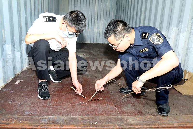 2020年6月1日,在宁波舟山港大浦口港区空箱检疫区,杭州海关所属舟山海关关员对完成检疫熏蒸处理的进境集装箱空箱进行效果评价,并现场处理了已被熏蒸死亡的若干只美洲大蠊。