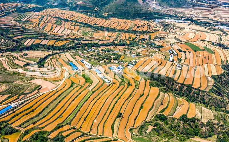 2020年6月3日,正值小麦成熟收割期,山西省运城市闻喜县河底镇,金色的小麦把层层梯田装扮的分外妖娆,格外壮美,空中俯瞰,宛如一幅大气蓬勃的金色田园画卷,十分壮观。
