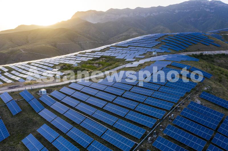 图片说明:2020年6月3日,山西省运城市稷山县西社镇,吕梁山脉中的荒山坡地被太阳能光板覆盖。