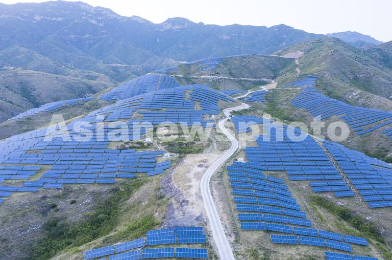 图片说明:2020年6月3日,山西省运城市稷山县西社镇,吕梁山脉中的荒山坡地被太阳能光板覆盖。