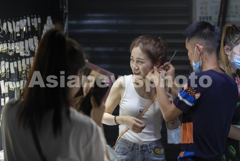 图片说明:6月3日,湖北省武汉市保成路夜市,一名顾客试戴耳环。