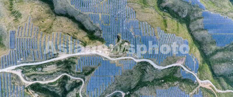 图片说明:2020年6月3日,山西省运城市稷山县西社镇,吕梁山脉中的荒山坡地被太阳能光板覆盖。