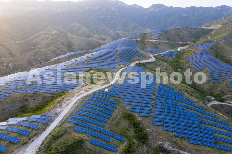 图片说明:2020年6月3日,山西省运城市稷山县西社镇,吕梁山脉中的荒山坡地被太阳能光板覆盖。