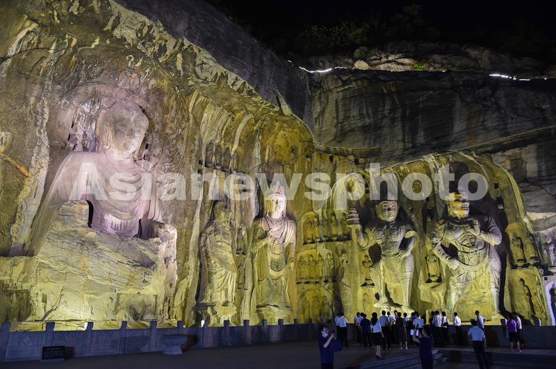 图片说明:2020年6月5日晚,河南洛阳,游客欣赏夜幕下的世界文化遗产-洛阳龙门石窟“卢舍那大佛”等佛像。