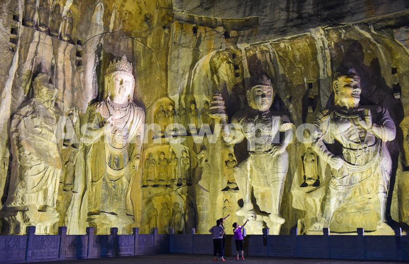 图片说明:2020年6月5日晚,河南洛阳,游客欣赏夜幕下的世界文化遗产-洛阳龙门石窟“卢舍那大佛”等佛像。