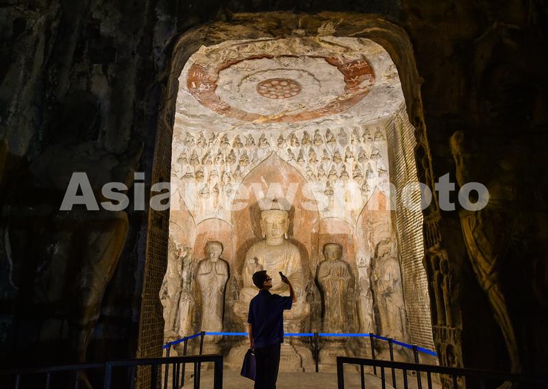图片说明:2020年6月5日晚,河南洛阳,游客在欣赏夜幕下的世界文化遗产-龙门石窟。