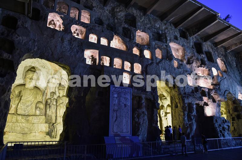 图片说明:2020年6月5日晚,河南洛阳,游客在欣赏夜幕下的世界文化遗产-龙门石窟。