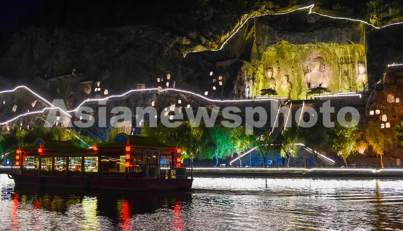 图片说明:2020年6月5日晚,河南洛阳,世界文化遗产-洛阳龙门石窟的夜景。