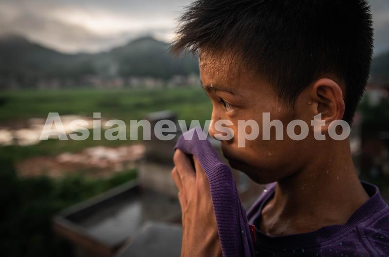 图片说明:6月3日,练完球后,满头大汗的张家城在天台上休息。