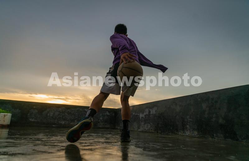 图片说明:6月3日,傍晚的雨刚停,张家城在自家的天台上练习起运球动作。