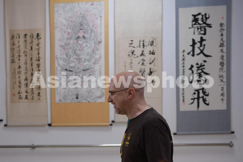 2020年6月10日,梅学良穿梭在友爱医院的楼道中,墙上挂满了他喜爱的中国传统文化作品。