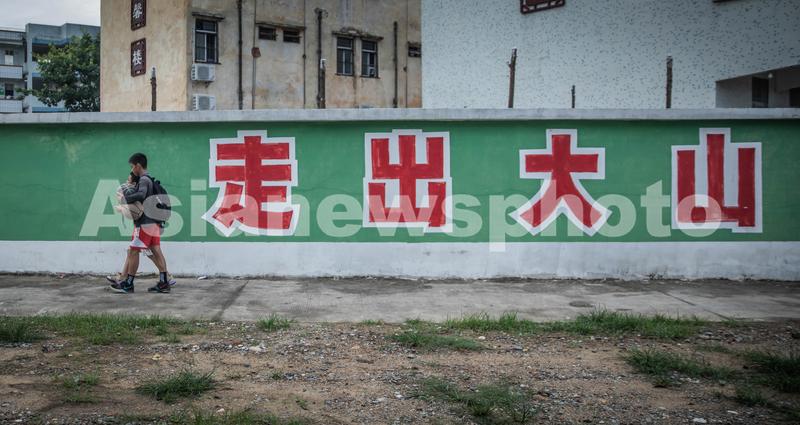 图片说明:每天上学放学,张家城都会路过外墙的标语。学校希望学生们能通过自己的努力走出大山。