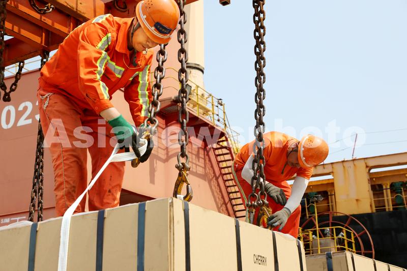 图片说明:2020年6月25日,码头工人在连云港港东方公司码头作业区泊位上忙碌。