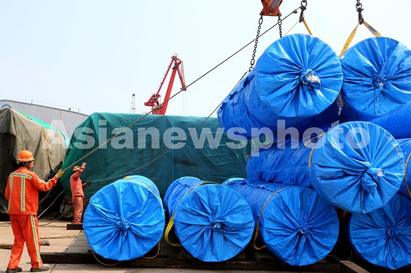 图片说明:2020年6月25日,码头工人在连云港港东方公司码头作业区泊位上忙碌。
