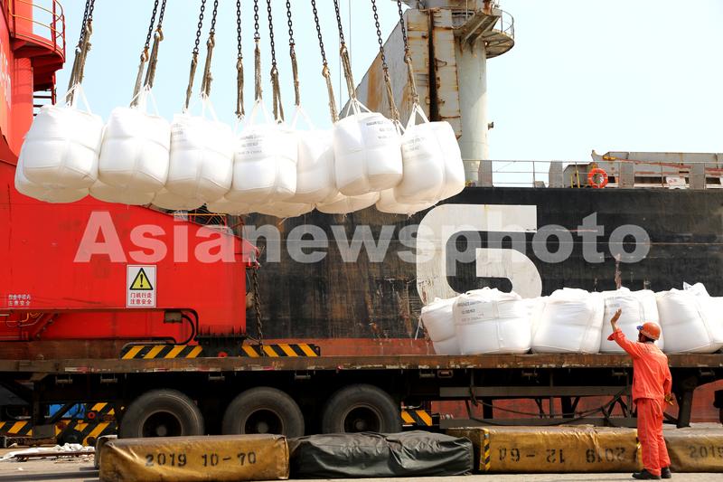 图片说明:2020年6月25日,码头工人在连云港港东方公司码头作业区泊位上忙碌。