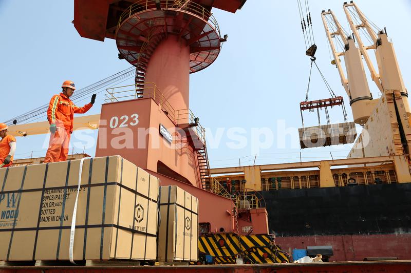 图片说明:2020年6月25日,码头工人在连云港港东方公司码头作业区泊位上忙碌。