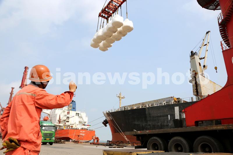 图片说明:2020年6月25日,码头工人在连云港港东方公司码头作业区泊位上忙碌。