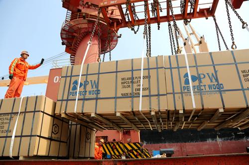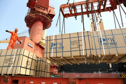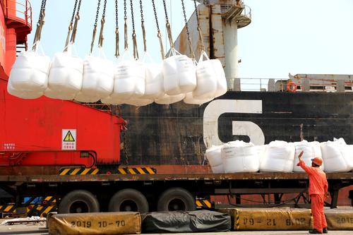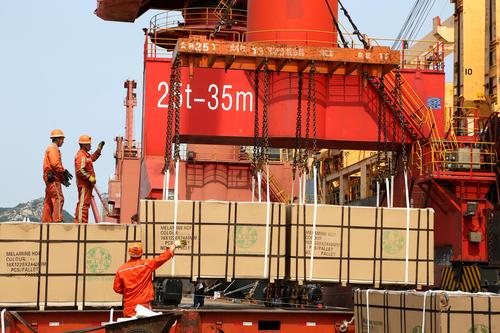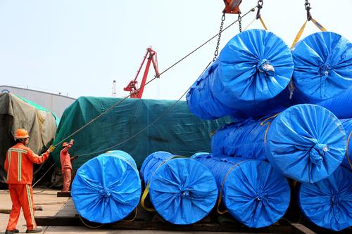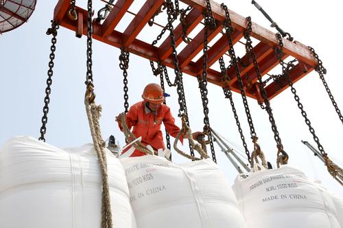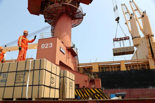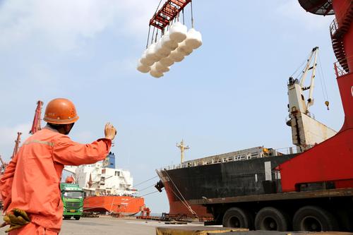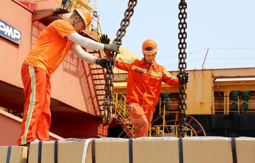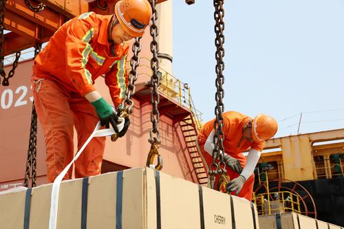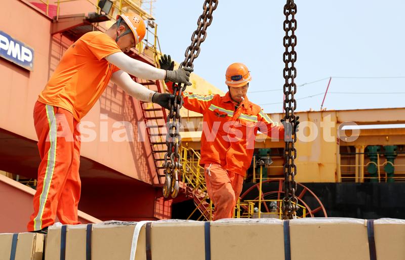 图片说明:2020年6月25日,码头工人在连云港港东方公司码头作业区泊位上忙碌。