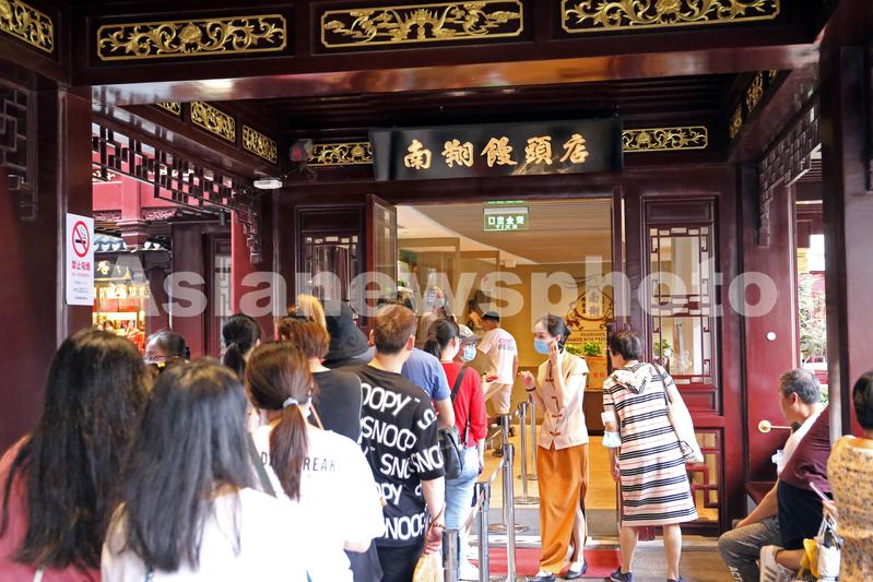 2020年6月26日,上海,老城隍庙豫园商城在端午期间举办国风庙会美食小吃及文创集市,网红南翔馒头店门口人们排长队购买。