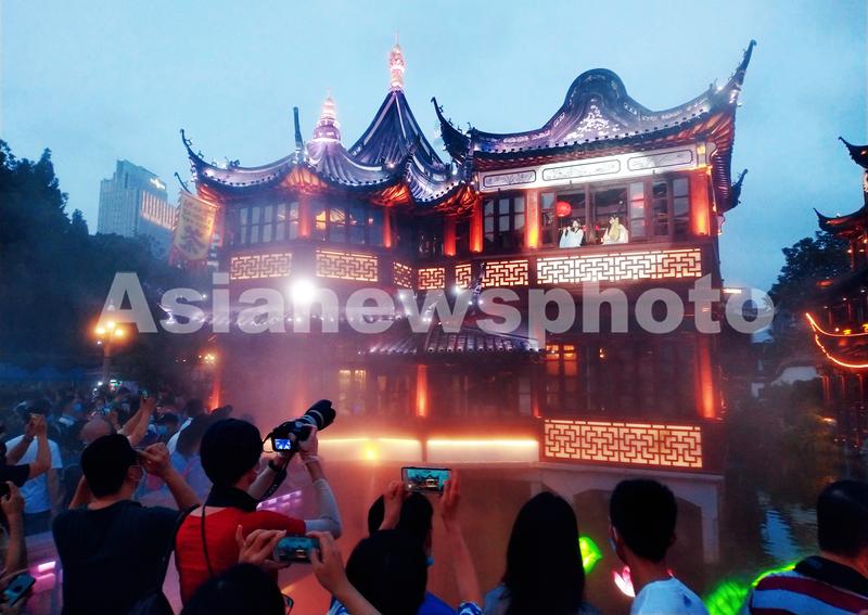 2020年6月26日,上海老城隍庙豫园商城举办的国风庙会上,汉服古装美女在湖心亭茶楼上面对九曲桥上众多游客用笛子和琵琶演奏中国民乐。