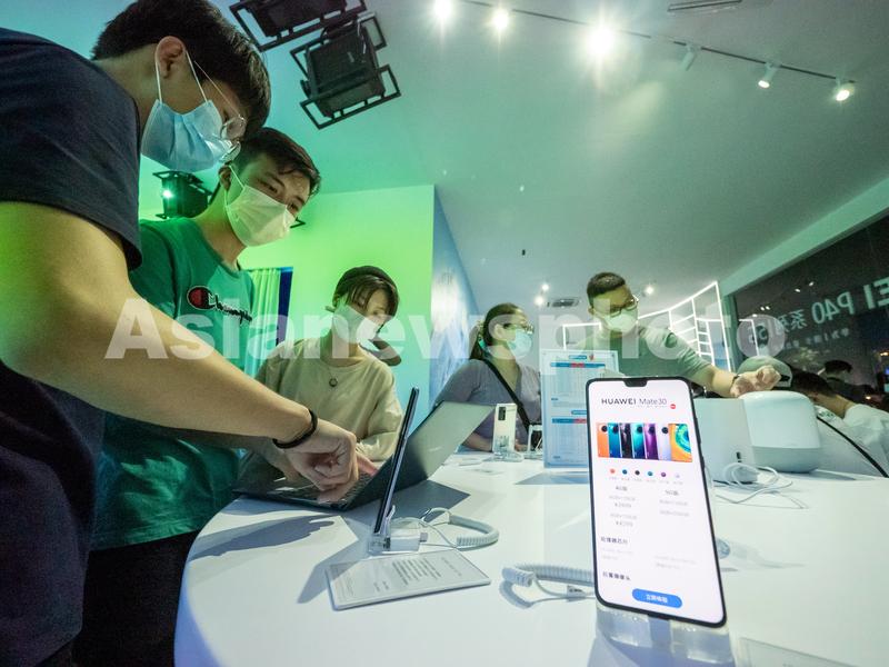 2020年6月27日,广东广州,华为P40艺术空间馆在天河城北广场登陆,市民在5G覆盖的巨型白色方盒子内体验华为产品。