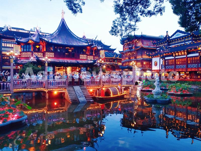 2020年6月26日,端午期间,上海老城隍庙豫园商城举办国风庙会美食小吃及文创集市,每到夜晚,著名的九曲桥及湖心亭等古建筑就被灯光夜景打扮成“复古夜市”。