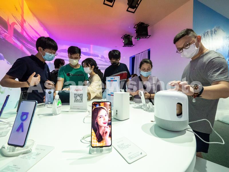 2020年6月27日,广东广州,华为P40艺术空间馆在天河城北广场登陆,市民在5G覆盖的巨型白色方盒子内体验华为产品。