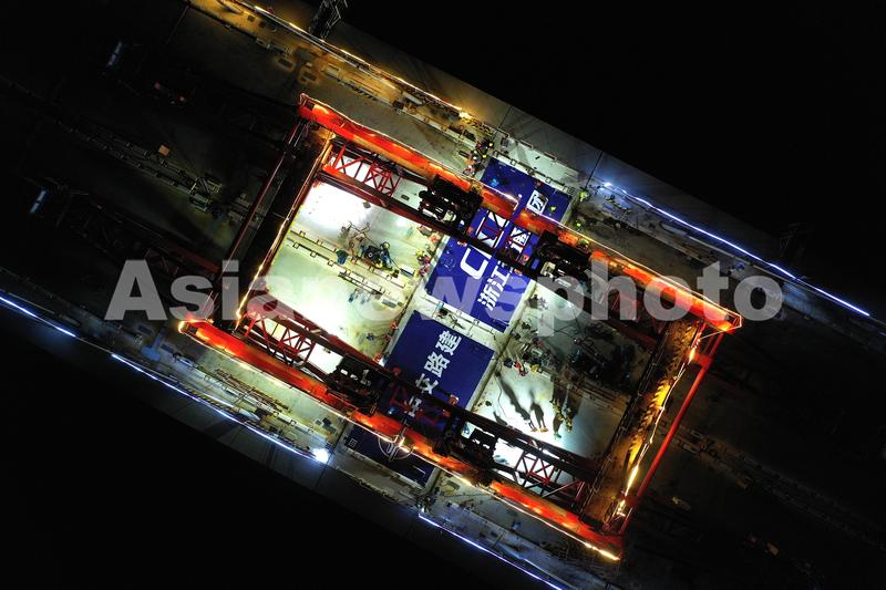 图片说明:2020年6月27日晚,舟岱大桥主通航孔桥编号为NH的合龙段钢箱梁正在吊装施工,于深夜完成合龙。