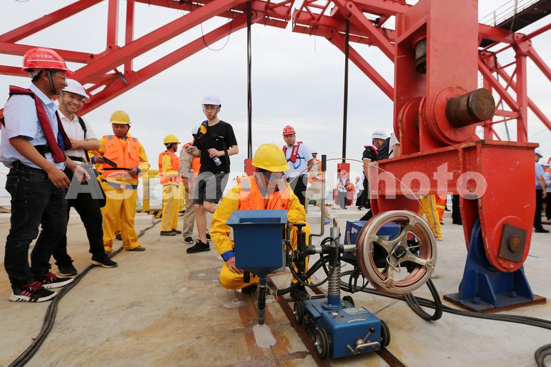 图片说明:2020年6月29日,宁波舟山港主通道项目舟岱大桥主通航孔桥架梁施工现场。