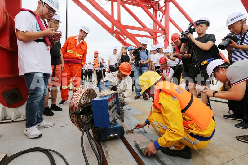 图片说明:2020年6月29日,宁波舟山港主通道项目舟岱大桥主通航孔桥架梁施工现场。