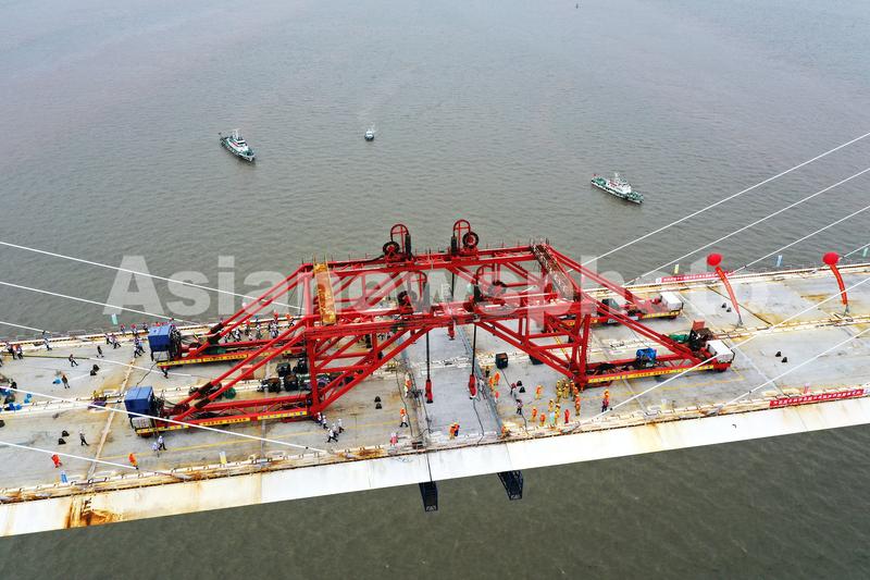 图片说明:2020年6月29日,宁波舟山港主通道项目舟岱大桥主通航孔桥架梁施工现场。