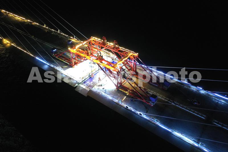 图片说明:2020年6月27日晚,舟岱大桥主通航孔桥编号为NH的合龙段钢箱梁正在吊装施工,于深夜完成合龙。