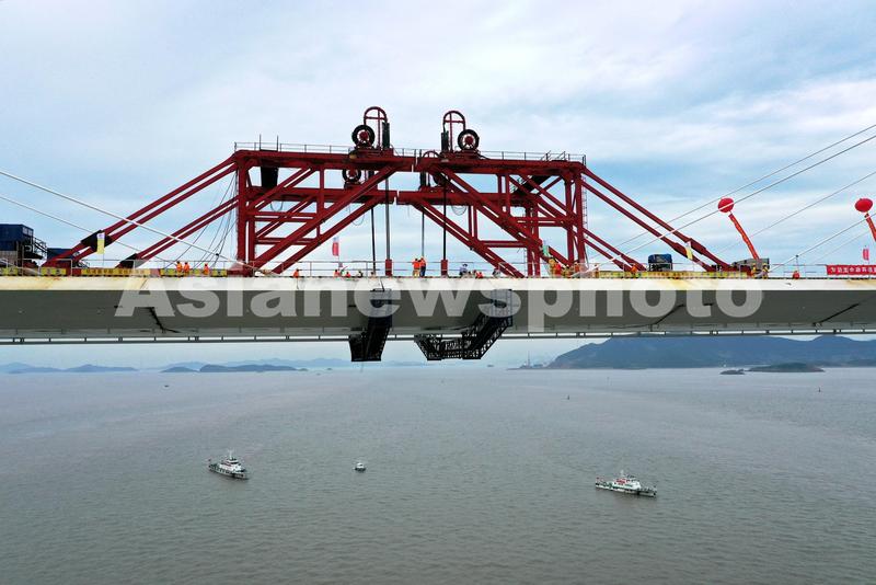 图片说明:2020年6月29日,宁波舟山港主通道项目舟岱大桥主通航孔桥架梁施工现场。