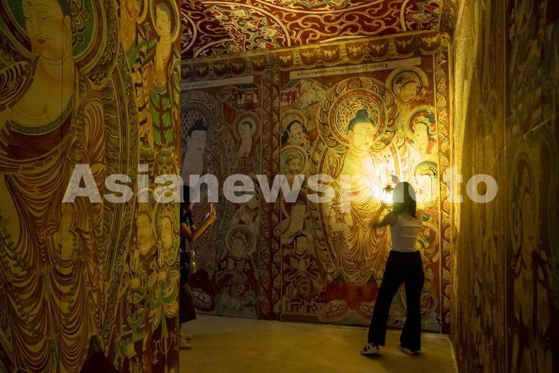 图片说明:6月30日,上海,观众在“千年绮华-从敦煌到高昌”宝石壁画沉浸式展览现场的千佛洞甬道复原展区拍照。