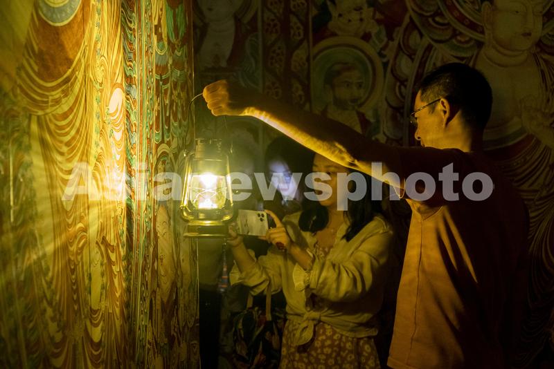 图片说明:6月30日,上海,观众在“千年绮华-从敦煌到高昌”宝石壁画沉浸式展览现场的千佛洞甬道复原展区拍照。