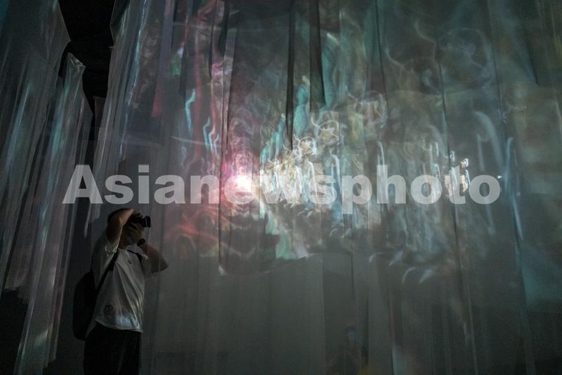 图片说明:6月30日,上海,观众在“千年绮华-从敦煌到高昌”宝石壁画沉浸式展览现场观展。