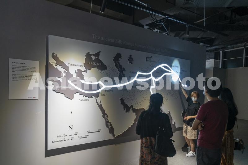 图片说明:6月30日,上海,观众在“千年绮华-从敦煌到高昌”宝石壁画沉浸式展览现场的”丝绸之路”路线图前听工作人员的讲解。