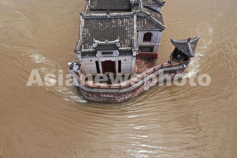 湖北省鄂州长江水位超设防水位,位于江心一块礁石上的鄂州观音阁下方十几米高的基座被淹。观音阁有“万里长江第一阁”的美誉,是全国重点文物保护单位,距今已有700余年的历史。