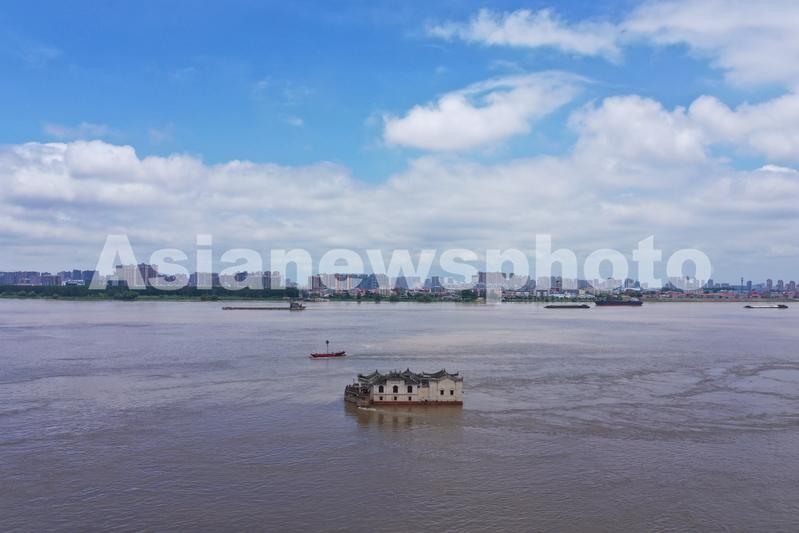 湖北省鄂州长江水位超设防水位,位于江心一块礁石上的鄂州观音阁下方十几米高的基座被淹。观音阁有“万里长江第一阁”的美誉,是全国重点文物保护单位,距今已有700余年的历史。