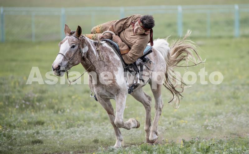 图片说明:2020年7月3日,表演者在敖包文化节上表演马术《跃马》。