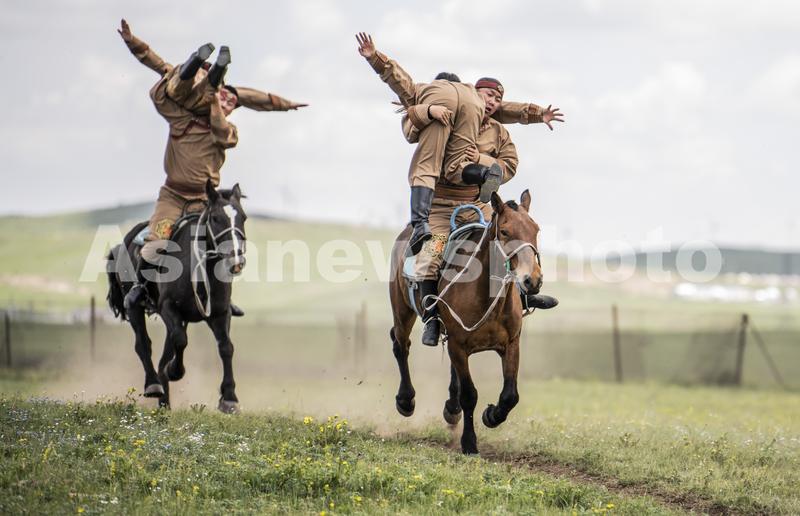 图片说明:2020年7月3日,表演者在敖包文化节上表演马术《单马双人》。