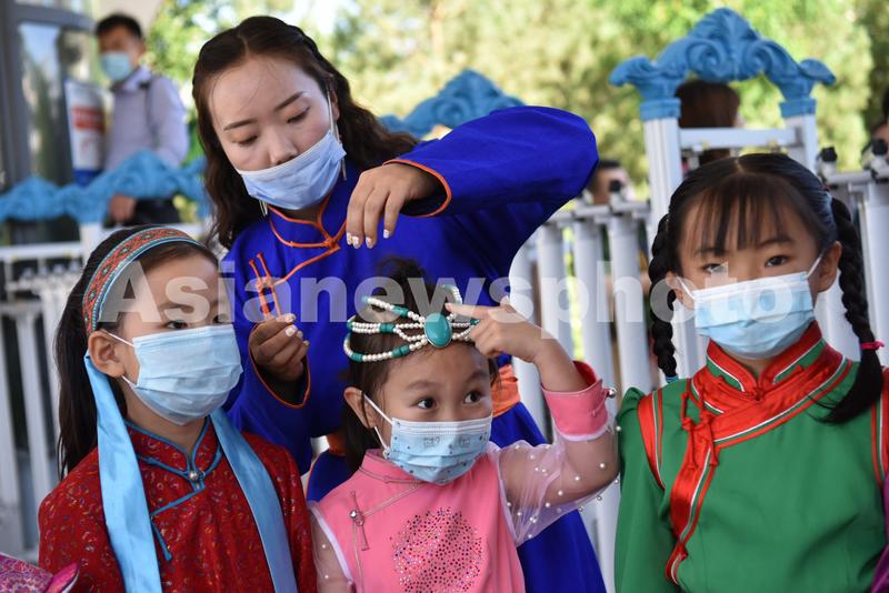 2020年7月7日,老师为身穿蒙古族服饰的小朋友整理头饰。