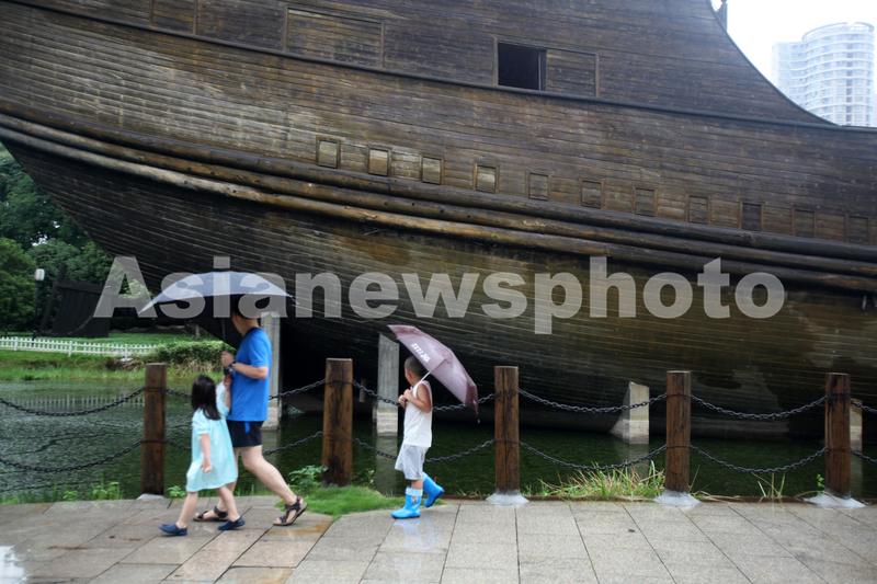 7月11日,游人在江苏省南京市的宝船厂遗址公园里观赏郑和宝船模型。