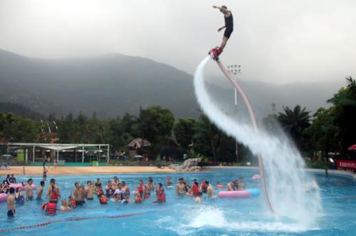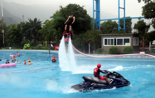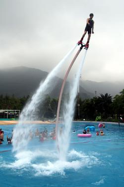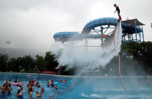 图片说明:2020年7月11日,运动员在江苏苏州乐园森林水世界进行水上飞人技巧表演。