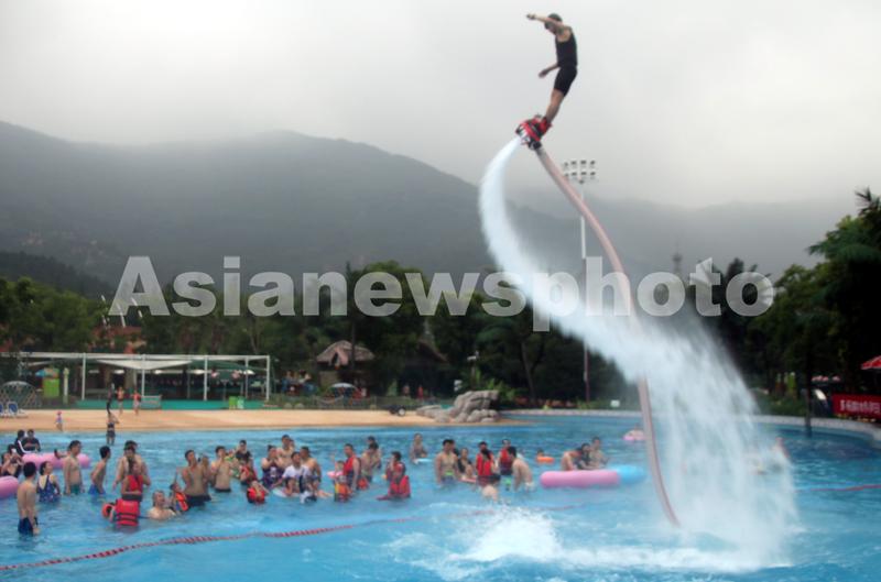 图片说明:2020年7月11日,运动员在江苏苏州乐园森林水世界进行水上飞人技巧表演。