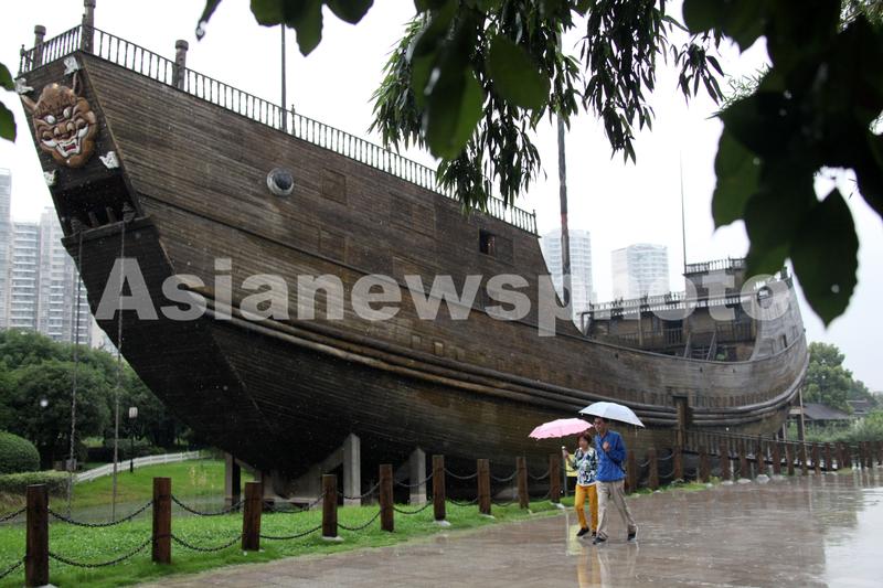 7月11日,游人在江苏省南京市的宝船厂遗址公园里观赏郑和宝船模型。